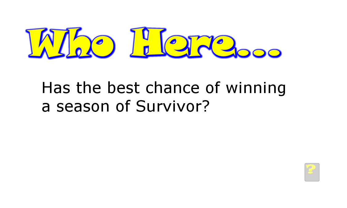 Who Here?™ is your ultimate party game for as many players as you have partiers (the more the better!). Included are 330 games cards describing interesting, whimsical, or revealing characteristics or scenarios that you match to the most applicable or deserving player. The first player to earn the target number of cards wins! Players want to earn cards, and can influence the judge with the best explanation why they match the card.