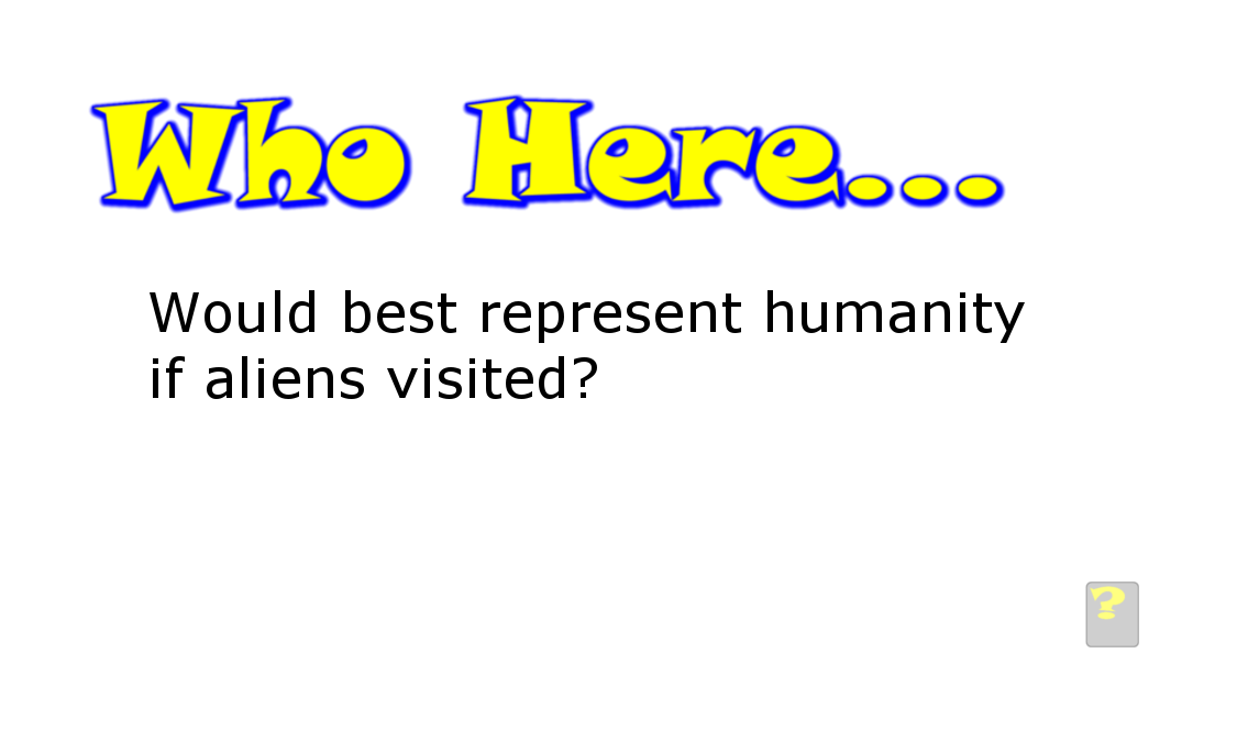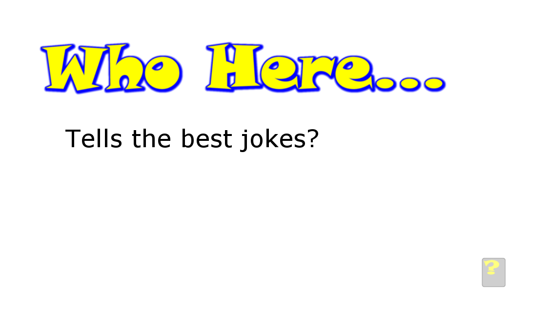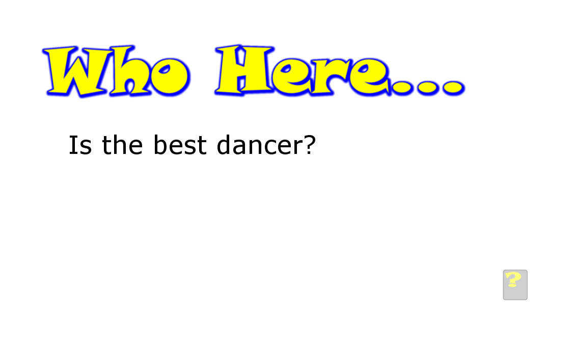 Who Here?™ is your ultimate party game for as many players as you have partiers (the more the better!). Included are 330 games cards describing interesting, whimsical, or revealing characteristics or scenarios that you match to the most applicable or deserving player. The first player to earn the target number of cards wins! Players want to earn cards, and can influence the judge with the best explanation why they match the card.